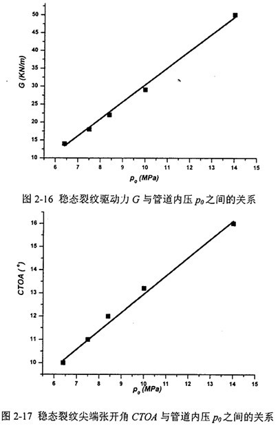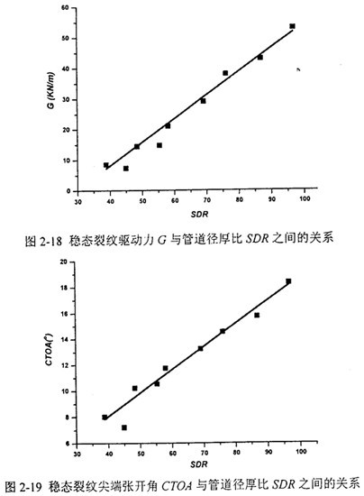 在裂紋穩(wěn)態(tài)擴(kuò)展的條件下,動態(tài)能量釋放率G或裂紋尖端張開角CT(劉同管道內(nèi)壓p0或徑厚比SDR之間均呈線性關(guān)系。由此關(guān)系可便捷地推算任意設(shè)計(jì)參數(shù)下的裂紋驅(qū)動力。通過和第四章介紹的小試件實(shí)驗(yàn)的動態(tài)斷裂韌性結(jié)果相對照,可以得到裂紋止裂或擴(kuò)展的結(jié)論。