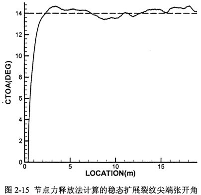 圖2-9表示了CTKOA的計(jì)算方法。由于在裂紋后方有很大的非線性變形,計(jì)算中張開位移用割線近似,采用8個單元的長度來計(jì)算CTOA。這一長度經(jīng)過與細(xì)化后的網(wǎng)格結(jié)果比較,誤差在10%之內(nèi)。