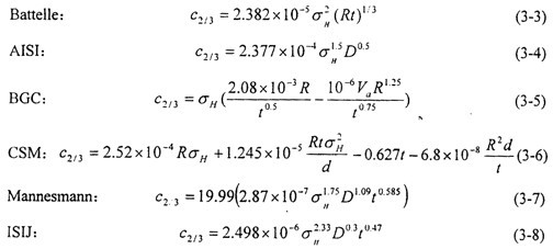在雙曲線法的基礎(chǔ)上,結(jié)合大量的實(shí)驗(yàn)結(jié)果對止裂韌性進(jìn)行標(biāo)定,世界各大研究機(jī)構(gòu)分別給出了簡便易算的經(jīng)驗(yàn)公式用以估算臨界止裂韌性,列舉如下: