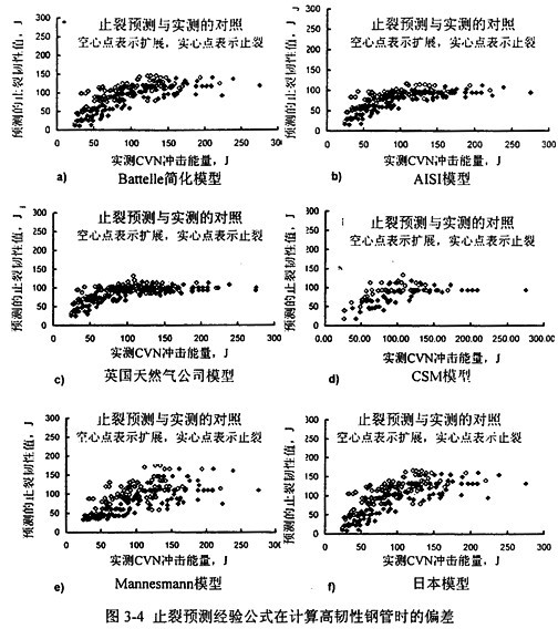 圖3-4表示了Battelle應(yīng)用Maxey雙曲線法對全尺寸實(shí)驗(yàn)數(shù)據(jù)庫所做的DDF止裂韌性預(yù)測,圖3-4a至圖3-4f分別對應(yīng)于式(3-3)至式(3-8)。圖中顯示的實(shí)驗(yàn)用管的鋼級(jí)包括X52到Xl00,管徑范圍從4O6mm到1422mm,實(shí)驗(yàn)最高壓力超過16MPa。可見,預(yù)測模型在管材韌性低于某一水平時(shí)預(yù)測結(jié)果與實(shí)物實(shí)驗(yàn)結(jié)果基本吻合,但當(dāng)管材韌性較高時(shí)出現(xiàn)明顯偏差,預(yù)測應(yīng)該止裂的管線沒有止裂。經(jīng)典的止裂預(yù)測模型在預(yù)測夏比能量值高于94J的管材時(shí),已經(jīng)偏于危險(xiǎn),即過高估計(jì)了管材的止裂性能。