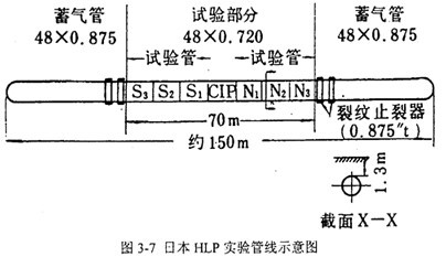 為了清楚地闡述在國外高韌性輸氣鋼管的全尺寸爆破實(shí)驗(yàn)中觀測到的由材料韌性引起的裂紋持續(xù)減速現(xiàn)象,有必要先對全尺寸實(shí)驗(yàn)的方法作較為細(xì)致的描述。本節(jié)的數(shù)據(jù)還會(huì)用作第四章小試樣實(shí)驗(yàn)和本章的韌性減速計(jì)算的比較。