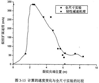 本文通過上述方法,對圖3-9至圖3-12中的全尺寸實(shí)測斷裂速度曲線結(jié)果進(jìn)行了校核,得到了比較吻合的結(jié)果,F(xiàn)以聯(lián)盟管道第一次實(shí)驗(yàn)IE段為例,設(shè)定擴(kuò)展的初速度為330m/s,速度變化的計(jì)算值同實(shí)驗(yàn)對比如圖3-15所示: