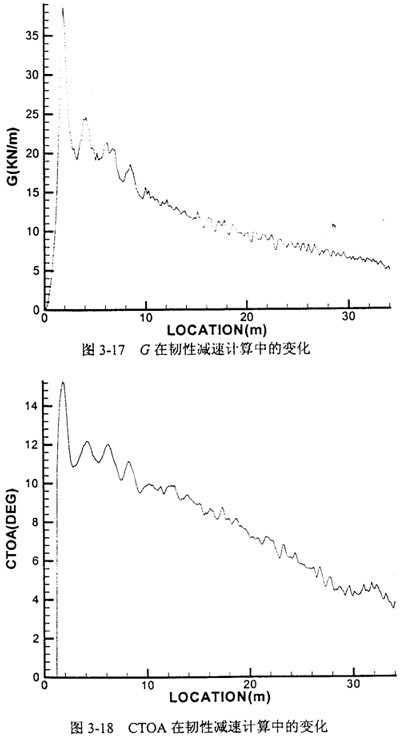 圖3-17和圖3-18是針對西氣東輸某特定設(shè)計(jì)參數(shù)的管線,應(yīng)用韌性減速機(jī)理計(jì)算時(shí)能量釋放率G和裂紋尖端張開角CTOA的變化。