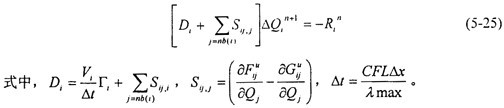 方程(5-24)可以采用顯式或隱式的方法進(jìn)行求解。但是由于受時間步長的限制,采用顯式的R-K時間推進(jìn)方法需要迭代的步數(shù)較多,計(jì)算很不經(jīng)濟(jì),因此本文采用了Gauss-Seidel迭代隱式求解的方法。
