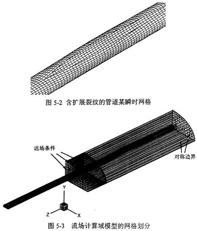 圖5-3是以圖5-2為依據(jù)建立的流場計(jì)算網(wǎng)格。設(shè)計(jì)參數(shù)為:裂紋擴(kuò)展速度200m/s,管道外徑1016mm,壁厚14.7mm,內(nèi)壓10MPa。