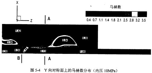圖5-4給出了XZ對稱面上的馬赫數(shù)分布。管道中的流動在裂尖出口處達(dá)到超聲速,而在對稱面附近發(fā)生了強(qiáng)烈的回流。標(biāo)示為B的位置壓力和密度發(fā)生了強(qiáng)間斷,意味著出現(xiàn)了激波。