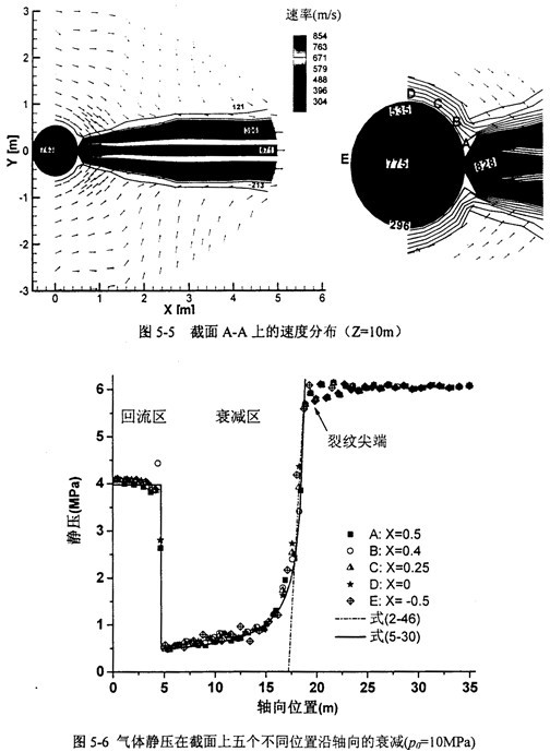 對含動態(tài)裂紋的高壓輸氣管道的流場模擬結(jié)果表明,氣體壓力模式(2-46)和(2-47)式在裂紋充分發(fā)展至不考慮回流區(qū)影響的條件下,對高壓高韌性管道仍然成立