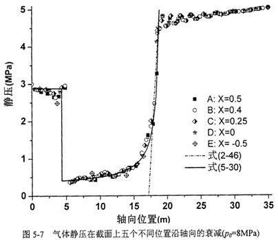 由于管道內(nèi)壁處的氣體靜壓等于該處管道承受的壓力,圖5-6和圖5-7中A-E各點(diǎn)沿Z向的氣體靜壓變化反映了管道承受壓力的軸向衰減規(guī)律。兩圖中的初始內(nèi)壓分別為10MPa和8MPa。