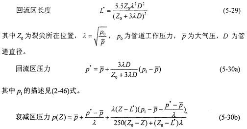 其三是衰減區(qū)的壓力變化。氣流通過裂紋尖端時,管壁上作用的氣體壓力沿軸向迅速衰減,經(jīng)驗(yàn)公式(2-47)中所用的衰減長度一般取為1.5倍管道直徑,最終衰減到零。計(jì)算表明衰減長度隨管道工作壓力的升高而增加,并且衰減區(qū)壓力的最低值與管道的工作壓力相關(guān)。由于對裂紋的擴(kuò)展?fàn)顟B(tài)影響甚微,裂尖前部的壓力不是關(guān)心的對象。