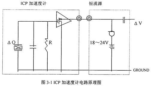 典型的集成壓電式(ICP)加速度計(jì)是在傳統(tǒng)的壓電加速度計(jì)基礎(chǔ)上耦合一個(gè)以場(chǎng)效應(yīng)管為核心的內(nèi)裝放大器電路所構(gòu)成。電路原理如圖3-1所示。ICP加速度計(jì)除了能帶來(lái)使用方便操作簡(jiǎn)化的優(yōu)越性外,較傳統(tǒng)的壓電加速度計(jì)還具有如下一系列的優(yōu)點(diǎn):