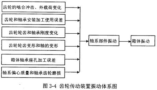 裝有齒輪、軸和軸承的軸系是齒輪傳動(dòng)裝置的關(guān)鍵部件。在齒輪傳動(dòng)裝置的工作過(guò)程中,箱體與其內(nèi)部的軸系部件構(gòu)成一個(gè)振動(dòng)耦合體系,見(jiàn)圖3-4。軸系部件的振動(dòng)通過(guò)軸承激發(fā)箱體振動(dòng),這樣在軸承外圈上安裝套圈并粘貼應(yīng)變片,拾取套圈上的應(yīng)變信號(hào),也就是對(duì)齒輪傳動(dòng)裝置箱體所受的動(dòng)態(tài)激勵(lì)力信號(hào)進(jìn)行測(cè)試和分析,就可對(duì)齒輪傳動(dòng)裝置內(nèi)的軸系部件進(jìn)行故障診斷。這種振動(dòng)測(cè)試故障診斷的方法優(yōu)點(diǎn)是能直接拾取齒輪傳動(dòng)裝置內(nèi)的軸系部件的振動(dòng)故障信號(hào),頻響范圍寬,費(fèi)用低。缺點(diǎn)是需專門(mén)制做套圈。