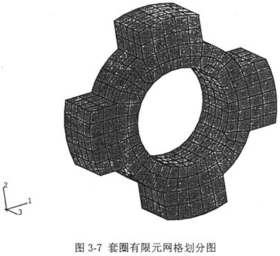 套圈是一個(gè)不規(guī)則的零件,先用有限元按三維八節(jié)點(diǎn)實(shí)體單元對(duì)它進(jìn)行網(wǎng)格劃分,圖3-7是有限元網(wǎng)格劃分圖。邊界條件是這樣處理的:由于套圈裝在減速機(jī)箱體孔中時(shí),和孔的配合是過(guò)盈配合,且套圈內(nèi)表面與傳動(dòng)軸外表面也是過(guò)盈配合,故套圈的配合面處均按固支對(duì)待。經(jīng)ABAQUS有限元軟件處理后輸出質(zhì)量矩陣和剛度矩陣,然后用廣義的Collatz包含定理求出它的低階固有頻率。