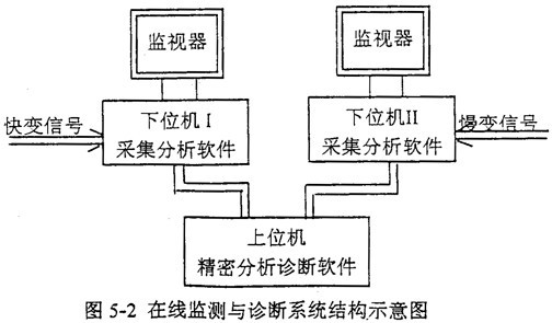 為了適應(yīng)日益更新的生產(chǎn)實際多種類型參數(shù)監(jiān)測和故障診斷的要求,建立由多臺微機并行運行構(gòu)成的在線連續(xù)實時監(jiān)測與快速診斷系統(tǒng)。圖5-2為多微機在線監(jiān)測與診斷系統(tǒng)結(jié)構(gòu)示意圖。這樣做的優(yōu)點是: