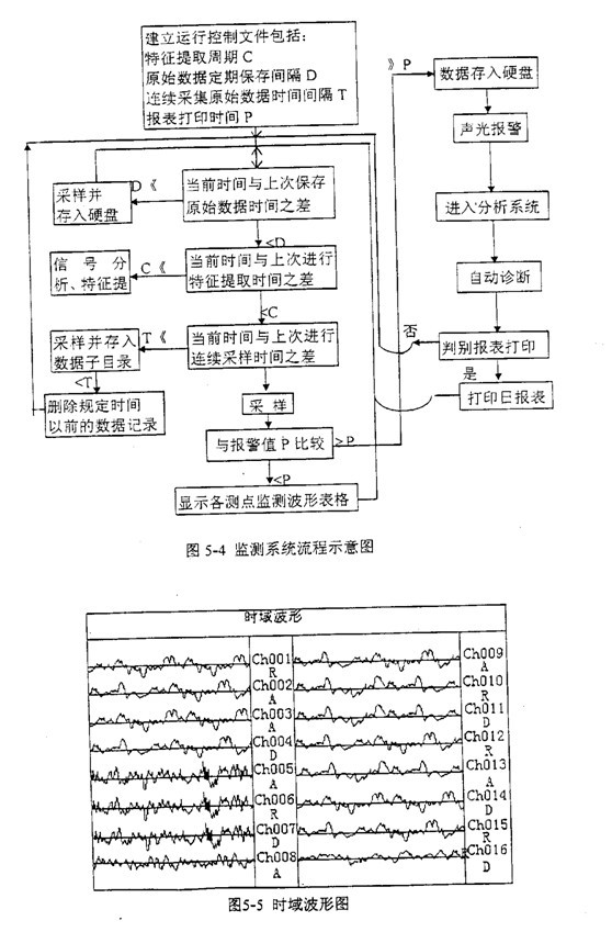 軟件的各個模塊通過動態(tài)數(shù)據(jù)和運行狀態(tài)數(shù)據(jù)庫聯(lián)系在一起,在下位機中,監(jiān)測系統(tǒng)控制著動態(tài)數(shù)據(jù)的采集、存儲、顯示和預(yù)處理,同時把監(jiān)測結(jié)果存入各機組運行狀態(tài)特征數(shù)據(jù)庫。在上位機中,詳細分析診斷程序塊調(diào)用運行狀態(tài)數(shù)據(jù)庫,得出診斷結(jié)果并調(diào)用打印程序塊輸出。圖5-3為數(shù)據(jù)流程示意圖,圖5-4為監(jiān)測系統(tǒng)流程示意圖。