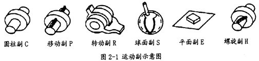 在等角速萬向聯(lián)軸器中,大部分都屬于連桿機構(gòu).最古老的雙聯(lián)十字軸萬向聯(lián)軸器機構(gòu)就是球面四連桿機構(gòu)。從大量的不同的機構(gòu)綜合中,有可能得出多種實用的等角速連桿機構(gòu),所以研究等角速理論,以連桿機構(gòu)的型式和尺度關系為對象,進行新的等角速理論的探索,在一定的意義上是可行的。在機構(gòu)學上,構(gòu)件同構(gòu)件間的連接稱為副,其不同的形式和代號如圖2-1所示: