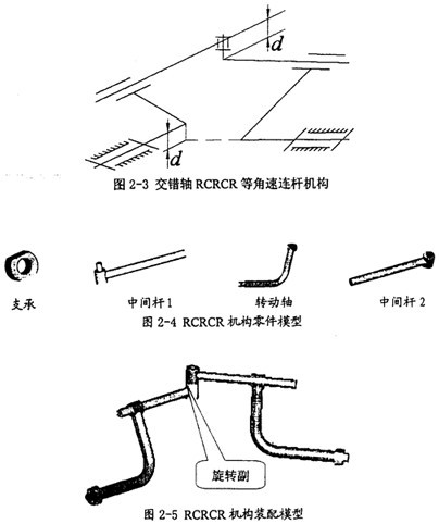 通過上述的方法,可以得到相交軸、交錯軸形式的多種等角速連桿機構(gòu)。在圖2-2中列出了其中的一部分,它們都是相交軸傳動的形式,當然全都是鏡面機構(gòu)。在這些機構(gòu)中有的已被應用在等角速聯(lián)軸器上,如球鉸柱塞式萬向聯(lián)軸器就是以RPSPR機構(gòu)為基礎。在圖2-3中列出了其中的一種較重要的交錯軸形式的等角速連桿機構(gòu)。