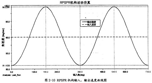 在此仿真中共輸出了此模型運動兩周的曲線,這證明此模型中雙曲柄肯定存在,按前面的理論,如果機構(gòu)是鏡面機構(gòu),在輸入轉(zhuǎn)速恒定的情況下,則輸出轉(zhuǎn)速就是恒定的,在圖2-10中,在輸入轉(zhuǎn)速恒定為90°/s時,其輸出轉(zhuǎn)速是周期變化的。后來經(jīng)模型修改,將原模型改為完全對稱結(jié)構(gòu),滿足鏡面機構(gòu)的條件,重新進行仿真,得出的結(jié)果是輸入轉(zhuǎn)速同輸出轉(zhuǎn)速完全相等。這從正反兩面說明了前面理論的正確性,同時也說明要想得到等角速傳動并不是一件簡單的事。不過本次證明只是對一種形式機構(gòu)而言,有關其它的機構(gòu)形式,還需要進一步的探索。