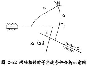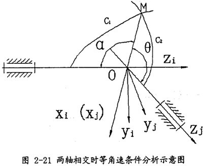 a.兩軸相交時,兩軸交點與嚙合點恒位于兩軸線所成夾角的平分面上,可實現(xiàn)萬向聯(lián)軸器等角速轉(zhuǎn)動(又稱同步);