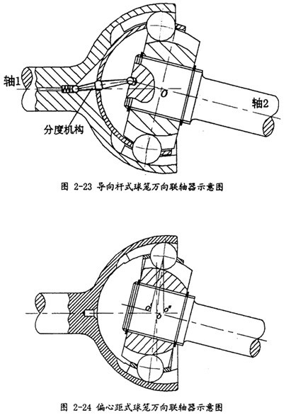 球籠式萬向聯(lián)軸器是目前性能最優(yōu)良,應用最廣泛的一種等角速萬向聯(lián)軸器,根據(jù)結(jié)構(gòu)形式的不同可分為兩大類,即導向桿式球籠萬向聯(lián)軸器和偏心距式球籠萬向聯(lián)軸器,分別如圖2-23和圖2-24所示。