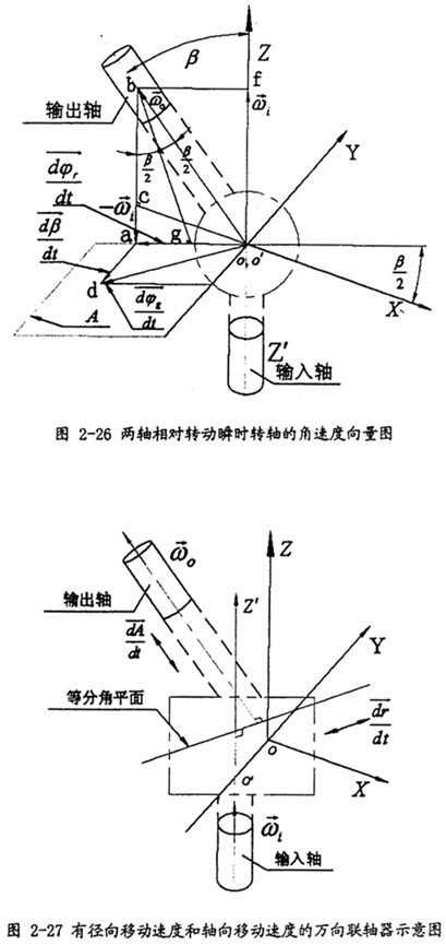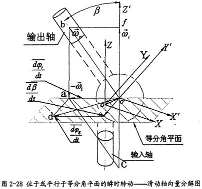 如圖2-28所示,輸入軸與輸出軸通過一個萬向聯(lián)軸器J聯(lián)接,兩軸夾角β為變量,輸出軸相對于輸入軸存在瞬時轉(zhuǎn)動——滑動軸,用矢量