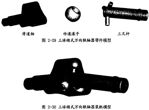 三球銷式萬向聯(lián)軸器是一種被廣泛應用的聯(lián)軸器,已有近30年的歷史,它同后面敘述的兩種聯(lián)軸器同屬三叉式萬向聯(lián)軸器,它們的傳動原理在本文的第三章中有詳細的描述,是一種運動規(guī)律十分復雜的聯(lián)軸器。它的裝配模型和零部件模型分別如圖2-30、圖2-29所示.在聯(lián)軸器轉(zhuǎn)動時,傳遞滾子既可相對滑道軸中的滑道軸向移動,也可沿三叉桿的軸頸轉(zhuǎn)動和徑向移動,以補償兩軸夾角的變化。