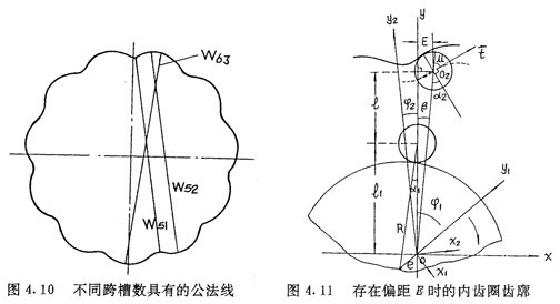 若令(4.30)式和(4.31)式中的E=0,得到的就是無(wú)偏距時(shí)的內(nèi)齒圈齒廓理論方程式(2.21)及公法線長(zhǎng)度(4.18)式。