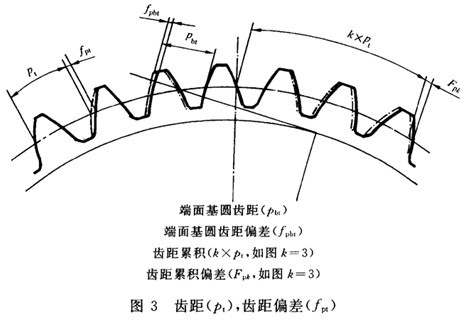 當各齒通過嚙合時,單個齒距偏差在切向綜合位移圓弧上有累積作用。這種影響在切向綜合偏差圖上看得很清楚,這樣,可確定齒距累積偏差值,(比如k=2.3,…)即在適當數(shù)量的齒距間測頂點切線的縱坐標。圖28中表示了單個齒距偏差、單個齒距和齒廓組合偏差以及近似的齒距累積總偏差。