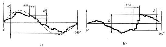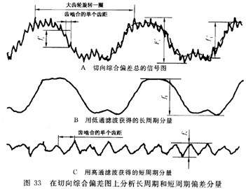 重要的事是記住,在濾掉長周期分量后,一齒切向綜合偏差fi′(圖33A)實際上變小了,這樣真正的最大偏差fi′就未必能在經濾波后的短同期分量的曲線(圖33C)中表示出來。