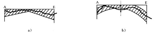 在線圖中,未修整齒面的螺旋線跡線是用一條直線來表示,而鼓形齒的齒面其相應的跡線是弓形曲線,在線圖中,鼓形齒齒面的設計螺旋線和平均螺旋線變線通常是拋物線(見圖23)。