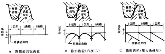 圖26所示意的是相當于三種不同齒廓的產品齒輪與測量齒輪相嚙合產生的三個齒嚙合周期的切向綜合偏差記錄圖,第一個表示無修形也無誤差,第二個則表示自齒高中部開始到有效齒廓兩端逐漸修形,而第三個則表示有“傾斜偏差”。