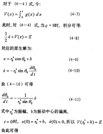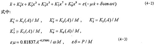 目前文獻上的一些方法對于弱非線性系統(tǒng)是有效的,而對于(4-2)式的強非線性系統(tǒng)則遇到了麻煩。由于描述非線性振動系統(tǒng)的微分方程種類繁多,沒有普遍的解法,因此,仍然只有極少非線性振動方程可求得精確解?尚械霓k法是針對不同非線性振動方程的特點尋求一些近似數(shù)值解法。為研究方便,將(4-2)式進一步寫成以下形式: