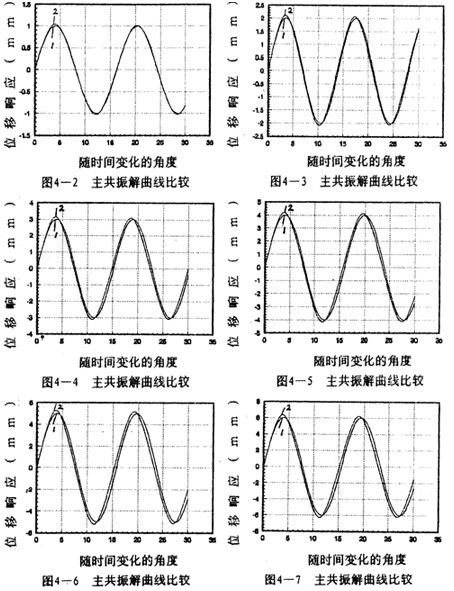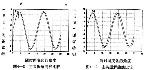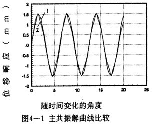 =2時兩者的重合性很好。(2).隨著振幅的增大,解析解曲線1和仿真解曲線2在相位上產(chǎn)生微小變化,解析解的相位超前仿真一個小量,原因是隨著振幅的增大,系統(tǒng)呈現(xiàn)更為強烈的非線性,而在推導(dǎo)中略去了高次項,但還是可以滿足工程的要求。(3)從(4-78)-(4-85)式中的各δ值可知,在聯(lián)軸器產(chǎn)生主共振的情況下,激振力很小。