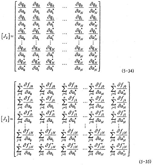 [J3]的計(jì)算實(shí)際上就是偏導(dǎo)數(shù) {fj({ a(k)})}/ { a(k)}的計(jì)算。計(jì)算方法與計(jì)算 {q({ a(k)})}的方法類似,故不再贅述。對于[J2],[J3]、分別有式(5-34)、(5-35)。