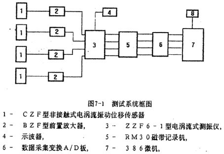 如圖6-l所示,實(shí)驗(yàn)臺安裝在一個(gè)4噸重的鋼質(zhì)平臺上,兩個(gè)球面球軸承支座1支承一根直徑為30毫米,長度為1500毫米的等直徑軸3,兩軸承座中間的袖上裝有一個(gè)直徑為300毫米,厚度為50毫米的圓盤2,軸的外伸端與調(diào)速電動機(jī)5之間有鋼絲繩聯(lián)軸器4相聯(lián)。在圓盤外緣以及在聯(lián)抽器從動端(內(nèi)套)與袖外伸端聯(lián)結(jié)處的水平和垂直方向各安裝一個(gè)非接觸式電渦流振動位移傳感器6。測試系統(tǒng)框圖如圖7-1所示。