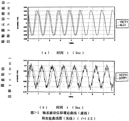 測量數(shù)據(jù)進(jìn)行分析處理后,結(jié)果如圖7-2~圖7-5所示。圖7-2(a)~(b)和圖7-3(a)~(b)分別給出調(diào)速頻率為1。2赫茲時(shí)圓盤和聯(lián)軸器從動端y方向的振動位移時(shí)域曲線,圖7-4、圖7-5分別給出聯(lián)軸器從動端、圓盤y方向的振動位移的理論和實(shí)驗(yàn)幅頻曲線圖(實(shí)線為理論曲線,圓點(diǎn)線為實(shí)驗(yàn)曲線),總的來看,理論與實(shí)驗(yàn)結(jié)果較好地重合。然而,在某些頻率點(diǎn)處,振運(yùn)位移幅值的理論計(jì)算與實(shí)驗(yàn)結(jié)果相差值,雖然絕對值差異并不大,但從相對值來講,差異較大,這是由于軸系還受到諸多因素,如軸承認(rèn)、軸承、電動機(jī)等振動的相互影響;當(dāng)然,測試儀器,數(shù)據(jù)處理都有可能產(chǎn)生誤差。由圖7-2、7-3還可以看到,理論計(jì)算與實(shí)驗(yàn)所得的振動位移時(shí)域曲線之間存在著相位差,這是因?yàn)椴杉瘮?shù)據(jù)時(shí),時(shí)域曲線的相位不能保證與理論計(jì)算相位一致造成的,但這不影響兩者的本質(zhì)特性。