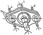 三環(huán)減速器是一種利用三相并列雙曲柄機(jī)構(gòu)來克服死點(diǎn)的連桿內(nèi)齒行星齒輪減速器,其基本結(jié)構(gòu)如圖5-0所示。它由低速輸出軸1 ,兩根高速輸入軸2 ,三片傳動(dòng)齒板3組成,各軸均平行配置,相同的兩根高速軸帶動(dòng)三片傳動(dòng)齒板呈120°相位差作平面轉(zhuǎn)動(dòng),傳動(dòng)環(huán)板上的內(nèi)齒圈與低速軸上的外齒輪相嚙合,形成大速比,其傳動(dòng)比