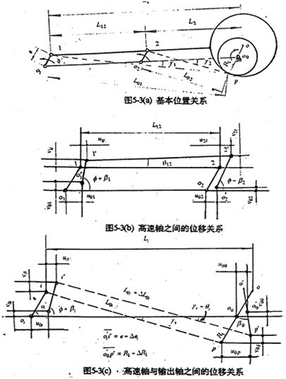 三環(huán)減速是多相并列連桿行星齒輪傳動(dòng)過約束機(jī)構(gòu)。應(yīng)該從整體系統(tǒng)上去考慮其變形關(guān)系。圖5-3是一相子機(jī)構(gòu)的位移關(guān)系圖。圖5-3(a)是基本位置圖、圖5-3(b)是高速軸之間的位移關(guān)系、圖5-3(c)是高速軸與輸出軸之間的位移關(guān)系(i=1、2)。由圖寫出各運(yùn)動(dòng)副中心的位移關(guān)系如下: