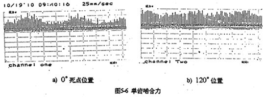 理想情況下,嚙合力的極小值在φ=0°、180°產(chǎn)生,極大值在φ=90°、270°產(chǎn)生,造成位置偏離的影響因素主要有軸承剛度,齒板剛度,嚙合角以及輸入轉(zhuǎn)速、傳動(dòng)比等等。其中軸承剛度的影響極大。在死點(diǎn)的嚙合力也產(chǎn)不并一定為零。哈合力可能為負(fù)值。為負(fù)值時(shí),將阻礙傳動(dòng)的正常轉(zhuǎn)動(dòng),產(chǎn)生內(nèi)齒輪副的干涉現(xiàn)象。并引起減速器沖擊振動(dòng)。因此,按照嚙合力過死點(diǎn)時(shí)為零的假設(shè)分布規(guī)律以及嚙合力為常數(shù)分布規(guī)律的模型分析,所得結(jié)果都是不可靠的。圖5-6是齒板死點(diǎn)位置180°及另一齒板位于超前120°嚙合點(diǎn)的單齒嚙合圖的測(cè)試結(jié)果。圖中每一棒線代表被測(cè)齒受嚙合力作用一次。比較兩圖可知,死點(diǎn)位置嚙合力總體水平低于120°位置時(shí)的嚙合力總體水平,與理論分析計(jì)算的結(jié)果完全吻合。
