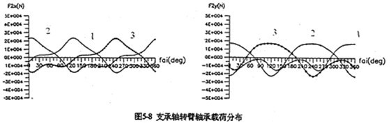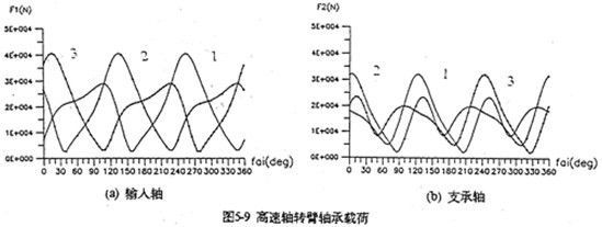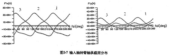 4.輸出軸的行星軸承總體載荷比支承軸行星軸承總體載荷大(圖5-9),特別是輸入軸X方向受力最大。輸入軸行星軸承載荷在死點(diǎn)附近取得最小值,在φ=105°、255°取得極大值。極大值產(chǎn)生的位置正好是機(jī)構(gòu)傳動(dòng)角最佳位置附近。在同一時(shí)刻,齒板上各輸入軸行星軸承的受力狀況是不是一樣的。當(dāng)某一齒板接近其死點(diǎn)位置時(shí),軸承載荷較小,而同時(shí)另外兩片遠(yuǎn)離死點(diǎn)位置的齒板上輸入軸行星軸承載荷要大得多。支承軸的軸承載荷在一個(gè)周期內(nèi)分別出現(xiàn)三次極大值和三次極小的值。由于這個(gè)原因使支承軸偏心套的微動(dòng)磨損比輸入軸偏心套的微動(dòng)磨損更為嚴(yán)重。行星軸承載荷的最大值為