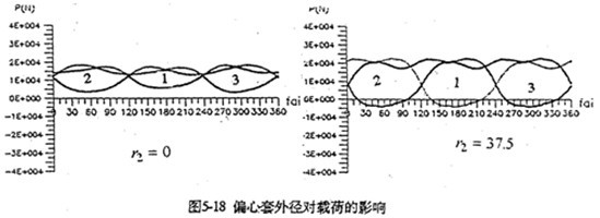 圖5-18是偏心套外徑對(duì)嚙合圖的影響。當(dāng)不考慮偏心套外徑(r2=0)時(shí),嚙合力分布為正值?紤]偏心套外徑(r2=37.5mm)計(jì)算結(jié)果,出現(xiàn)負(fù)向嚙合力。而且其幅值明顯增大。輸入扭矩也不再是固定值。因此,對(duì)三環(huán)減速器進(jìn)行動(dòng)力計(jì)算,必須考慮r2的影響。此外,行星軸承內(nèi)外圈接觸承載位置,也影響三環(huán)減速器的動(dòng)力性能。