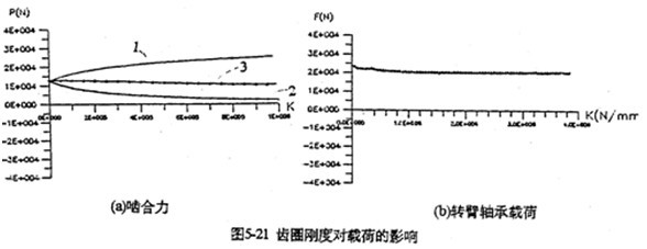 只考慮行星軸承變形及齒板變形時(shí),影響三環(huán)減速器載荷特性的剛度,主要是行星軸承剛度、和內(nèi)齒圈的變形剛度。軸承剛度與軸承材料、間隙、油膜等很多因素有關(guān)。圖5-19是輸入軸行星軸承剛度對(duì)嚙合力及行星軸承載荷的影響。當(dāng)輸入行星軸承剛度小一個(gè)數(shù)量級(jí)時(shí),負(fù)向嚙合力區(qū)域增大(見圖5-19a);隨剛度減小、各相嚙合力越不均恒(圖5-19b),輸入軸行星軸承剛度的影響比輸入軸行星軸承剛度更大,見圖5-20所示。嚙合力及各行星軸承載荷在軸承剛度較小的情況時(shí),都出現(xiàn)正常載荷的10倍以上的沖擊現(xiàn)象,沖擊產(chǎn)生的位置隨剛度變化不同。內(nèi)齒圈剛度對(duì)載荷的影響與行星軸承剛度相反(見圖5-21所錄)。當(dāng)剛度越小時(shí),三相齒板的嚙合力越均恒(見圖5-21a),而且行星軸承載荷幅值基本上不變(見圖5-21b)。同此可推知,減小三環(huán)減速器振動(dòng)的途徑之一就是提高行星軸承剛度,減小內(nèi)齒圈剛度。這可以通過對(duì)行星軸承進(jìn)行預(yù)緊,和采用軟齒面或大柔度齒圈的辦法,以使嚙合力和行星軸承載荷均衡化,以達(dá)到減振降噪的目的。