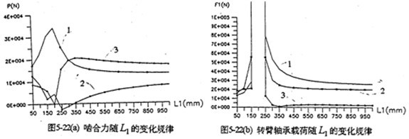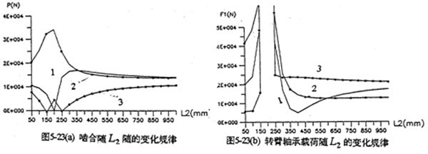 各軸水平布置時(shí),軸間的中心距變化,將引起各載荷大小幅值、規(guī)律均發(fā)生變化。圖5-22是輸入軸相對(duì)輸出軸位置變化時(shí),減速器的嚙合力及軸承載荷變化情況。由圖可知,當(dāng)輸入軸與支承軸中心距(L2=200mm)很小時(shí),三齒板的嚙合力分配很不均衡,隨著L1的增加嚙合力趨于均衡(見圖5-22a)。行星軸承載荷變化情況見圖5-22b所示。