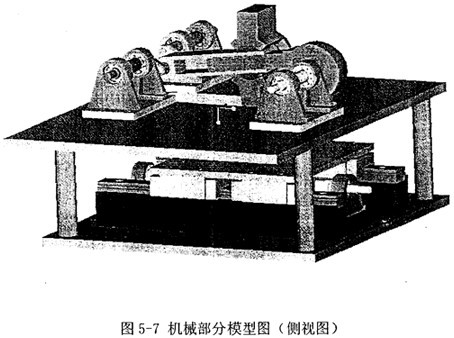 如圖5-1所示為實驗系統(tǒng)機械部分的模型圖片,為了顯示清楚,沒有配置外邊的機箱,整個機構(gòu)是完全開放式的,這樣也便于實驗觀察。該機械結(jié)構(gòu)由上下兩個機架支撐,和前面的原理圖不同,下邊機架上放置昆旋導軌構(gòu)件(未顯示伺服電機),上邊機架則是上圖所示的其余連桿機構(gòu)及其支撐架、軸承等(未顯示常速電機)。