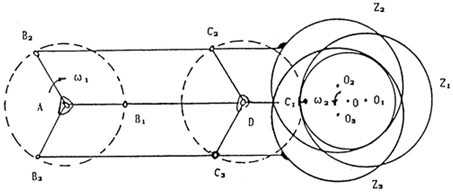 眾所周知,雙曲柄機(jī)構(gòu)的最大缺點(diǎn)就是存在死點(diǎn)位置,即當(dāng)曲柄,與連桿共線(xiàn)時(shí),機(jī)構(gòu)處理運(yùn)動(dòng)不確定位置,其傳動(dòng)角為零,機(jī)械無(wú)法運(yùn)動(dòng)。為了克服死點(diǎn)位置,目前已出現(xiàn)了三種解決方法:其一是在同一行星輪上布置多套雙曲柄機(jī)構(gòu)的方法:其二是采用雙曲柄動(dòng)力輸入式方法;基三是采用多相并列式雙曲柄機(jī)構(gòu)來(lái)克服死點(diǎn)的方法。三環(huán)減速器就是用三相并列雙曲柄機(jī)構(gòu)來(lái)克服死點(diǎn)位置,如圖2-2所示。