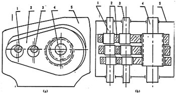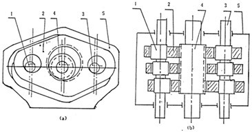 101型三環(huán)減速器基本構(gòu)造如圖2-4(a)(b)所示。其輸出軸4位于輸入軸1和支承軸3之間,受力情況要優(yōu)于110型三環(huán)減速器。