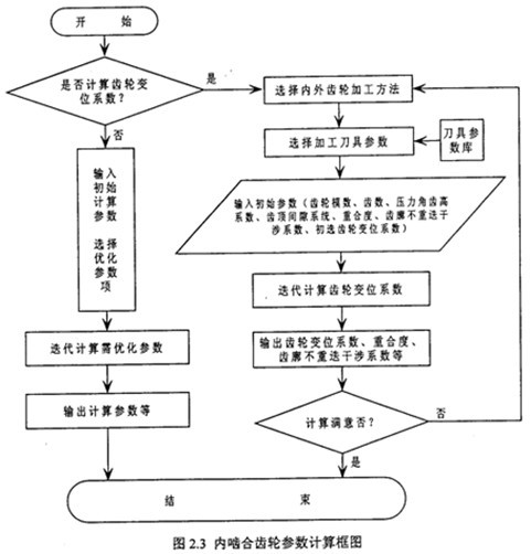 在少齒差內(nèi)嚙合傳動(dòng)中,變位系數(shù)的確定是設(shè)計(jì)的關(guān)鍵。齒輪的實(shí)際幾何尺寸與齒輪的加工方法有直接的關(guān)系,所以用不同的齒輪加工方法的計(jì)算公式來(lái)推導(dǎo)變位系數(shù)的迭代公式,所得迭代結(jié)果不一樣。內(nèi)嚙合齒輪參數(shù)計(jì)算模塊中,已經(jīng)由公式(2.5 )~(2.9 )推導(dǎo)了少齒差內(nèi)嚙合傳動(dòng)的各種實(shí)際加工情況下的變位系數(shù)的計(jì)算迭代公式,圖(2.3)為齒輪變位系數(shù)計(jì)算框圖。