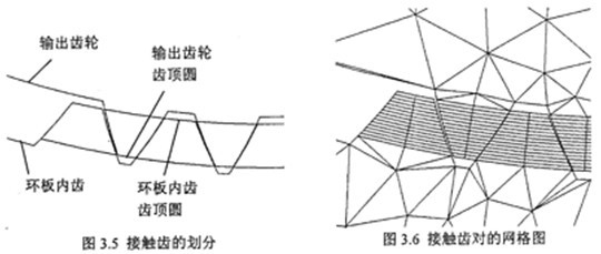 因為在少齒差內(nèi)嚙合中,不處于嚙合位置的齒對在進入嚙合之前以及在脫離嚙合之后,其內(nèi)、外齒廓間的間隙非常小,因此雙環(huán)減速器環(huán)板內(nèi)齒輪嚙合傳動在載荷作用下,因彈性變形實際接觸齒對數(shù)遠大于理論重合度,在傳遞載荷的過程中,輪齒的變形量要大于一部分齒對的間隙,這些齒對就要接觸并同時分擔載荷,這就大大提高了整個齒輪傳動裝置的承載能力。同時實際齒輪的接觸對數(shù)及接觸應(yīng)力,隨著載荷增大而相應(yīng)增加。因而少齒差內(nèi)嚙合行星齒輪傳動的實際接觸齒對數(shù)的確定,對齒輪承載能力的估算以及齒輪模數(shù)的正確確定具有重要意義。對于齒輪的接觸問題的,國內(nèi)外學者對此已作了不少研究,取得一些研究成果。然而這些研究有的沒有考慮誤差的影響,有的僅考慮內(nèi)外嚙合齒輪副齒廓理論間隙,沒有考慮輪齒制造誤差和輪齒的彈性變形的影響。本文對于環(huán)板內(nèi)齒輪接觸問題進行了計算,計算時考慮內(nèi)外嚙合齒輪副齒廓理論間隙、制造誤差及輪齒彈性變形的影響,在此基礎(chǔ)上,建立了少齒差內(nèi)嚙合行星齒輪傳動實際接觸齒對數(shù)及各齒間載荷分配的理論分析計算的實體模型,利用I-DEAS軟件進行了環(huán)板內(nèi)齒輪接觸有限元計算,并用該軟件分析計算了在不同載荷工況下的實際接觸齒對數(shù)、最大接觸應(yīng)力以及兩環(huán)板上各接觸齒的載荷分配情況。