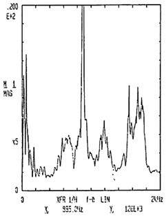 有了脈沖激勵信號和脈沖響應信號后,CF-355頻譜分析儀就能計算出測點12X向由于14點X向激勵間的頻響函數(shù)H(ω)及其相干函數(shù),如圖4-5所示。圖4-6是頻響函數(shù)H(ω)的倒數(shù)。