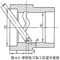 由于圓柱正弦活齒減速器徑向尺寸小,在現(xiàn)有國(guó)產(chǎn)銑刀的條件下,加工殼體的內(nèi)空間正弦滾道具有很大的難度,本文提出一種加工方案,較好的解決了這個(gè)難題。采用五坐標(biāo)數(shù)控加工中心,將球狀銑刀傾斜一定角度,斜插進(jìn)殼體內(nèi)圓柱面進(jìn)行銑削加工,其加工位置示意圖如圖6-2。