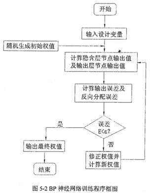 三層前饋型BP網(wǎng)絡(luò)采用BP算法來(lái)調(diào)整網(wǎng)絡(luò)連接權(quán)值和節(jié)點(diǎn)閾值。BP算法,即誤差逆?zhèn)鞑W(xué)習(xí)方法,是一種曲型的誤差修正方法。BP算法是一個(gè)種有教師的學(xué)習(xí)算法,整個(gè)網(wǎng)絡(luò)學(xué)習(xí)過(guò)程由信息的正向傳動(dòng)播和誤差的反向傳播兩上階段構(gòu)成,在正向傳播的過(guò)程中,輸入信息從輸入層經(jīng)隱含層逐層處理,并傳向輸出層,如果不能在輸出層得到期望的輸出,則轉(zhuǎn)入反向傳播,運(yùn)用梯度下降法連接權(quán)關(guān)于誤差函數(shù)的導(dǎo)數(shù)沿原來(lái)的連接通路返回,通過(guò)修改各層的權(quán)值使得誤差函數(shù)減小,直到達(dá)到收斂為止。神經(jīng)網(wǎng)絡(luò)練過(guò)程如圖5-2所示。